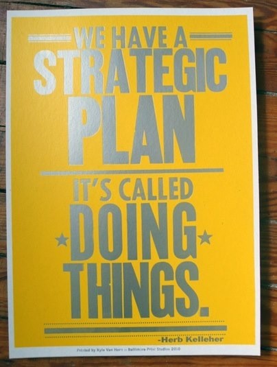 En Zaragoza Activa “somos más de hacer que de pensar” repito como un mantra a menudo a mi equipo, igual que muchas veces cuento que cuando llegué al Ayuntamiento de Zaragoza los puestos de pensar ya estaban cogidos a mí sólo que me quedó el de hacer. Os dejo un cartel chulísimo y que define perfectamente la filosofía de mi equipo: “Tenemos Plan Estratégico, se llama hacer las cosas” vía Eduardo Cariñena. La planificación estratégica es una herramienta obligatoria en las políticas públicas pero nunca debería convertirse en un pretexto para tomar distancia respecto a la acción.