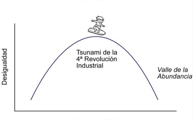 Por lo tanto, si damos por bueno el augurio del Foro de Davos, y asumimos que estamos comenzando ya la 4ª revolución industrial, al mismo tiempo que aceptamos las tesis de Piketty sobre desigualdad; la conclusión es que o bien Kuznets no tenía razón, o bien, que no estamos ante una simple ola, sino ante un tsunami, que ha encadenado dos ciclos de crecimiento e innovación, sin apenas tiempo de recuperación entre ellos.