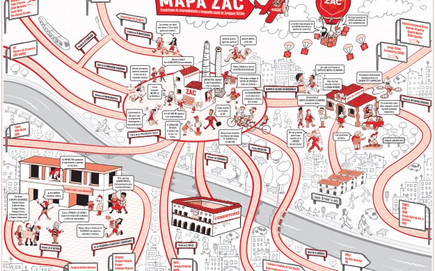 Pero ¿Qué es exactamente el ecosistema de emprendimiento e innovación social de Zaragoza Activa (ZAC)? La respuesta es muy larga, pero quizá este cómic, con el mapa de La Azucarera, Las Armas y La Casa del Director, de los geniales Dani García Nieto y Miguel Ángel Hernández, te ayude a hacerte una idea.